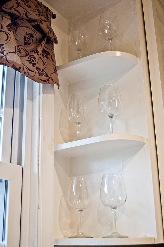 Good Saturday morning, friends! I am working today, so it's kind of a bummer. I hope you all enjoy your Saturdays for me! I have a really cute/easy project that I have been wanting to do for a while to share with you guys! We have lovely shelves that go up the sides of our kitchen window, which we use to display our wine glasses. I like the look because it is very simple, but is still elegant looking. Not overwhelming or cluttered looking at all (it is easy to make these types of shelves look cluttered).