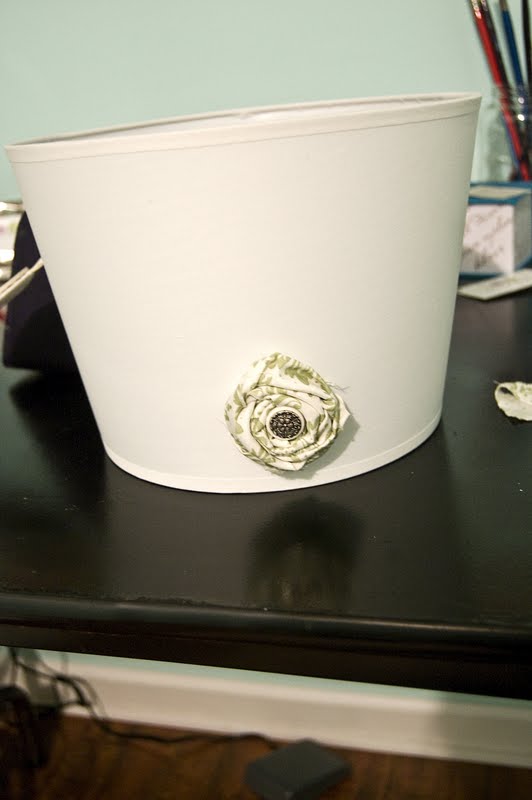 Well, truth is...I don't see it getting replaced any time soon. So I got a wild hair to make it cuter at least. So I plucked it down from the ceiling and began thinking about what I could do to spruce it up that would still look cute if I wanted to use it on an actual lamp someday.I decided to take some strips of remnant fabric and make a rosette. I happened to have a few vintage buttons floating around too, so I hot glued them all to the lamp shade.
