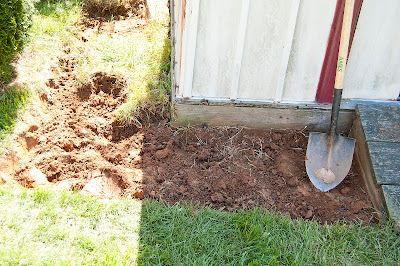 First, he dug around the front and sides the shape of the bed that he wanted. This is easier with a square shovel, but we don't have one, so he made do with the one in the pic!
